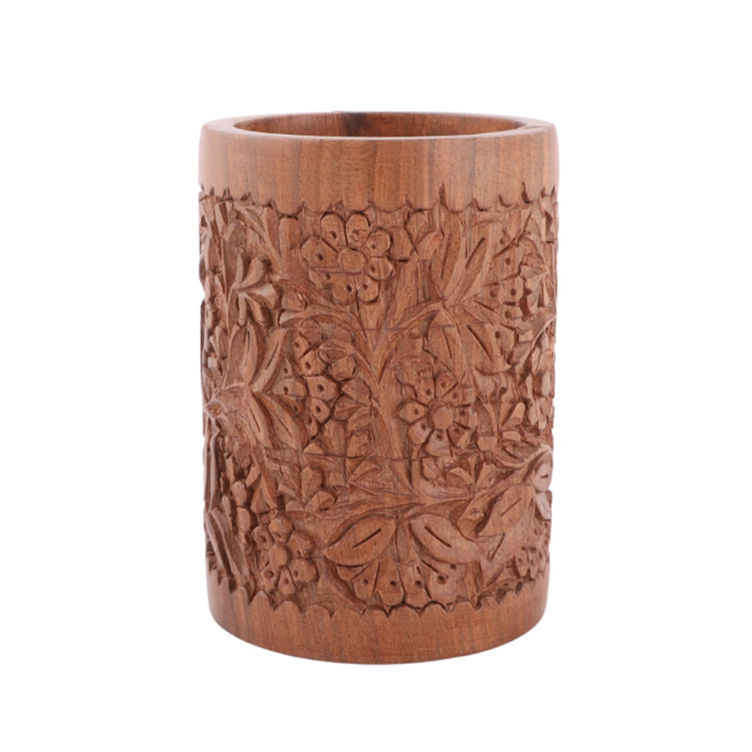 Kashmiri Walnut Hand-Carved Pen Stand (3 x 3 x 4 Inches)